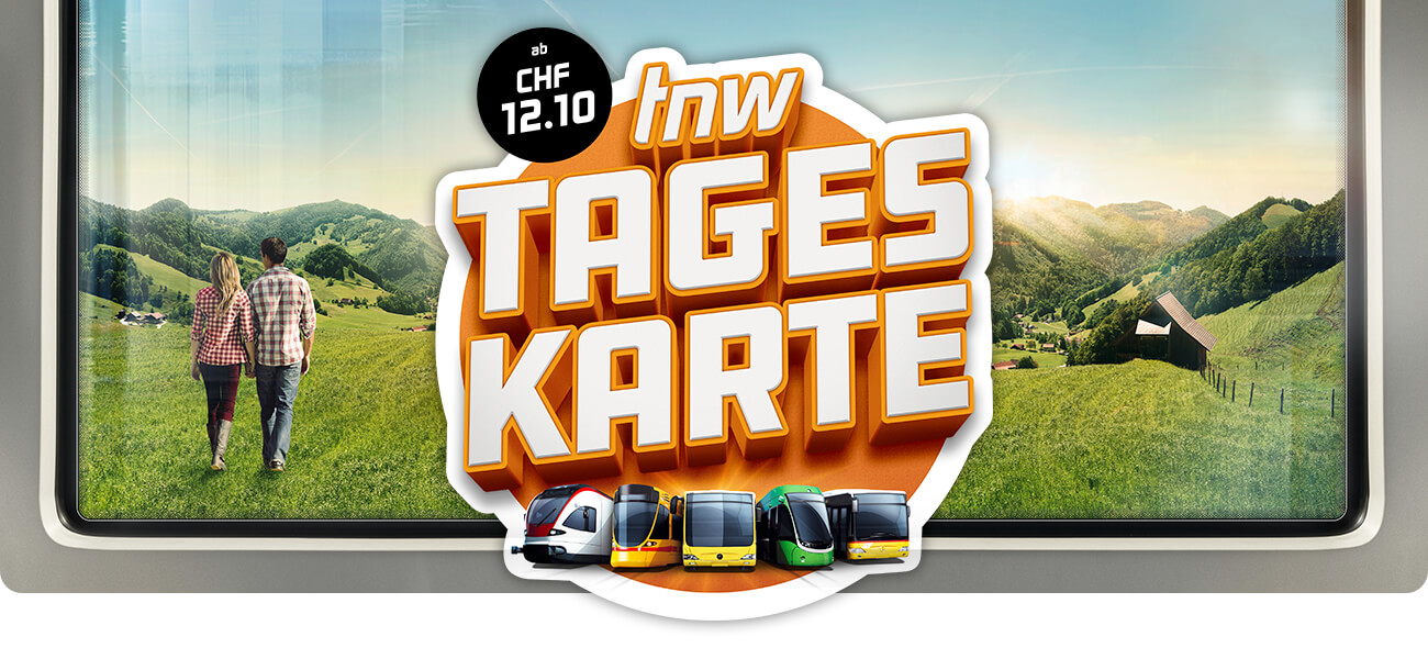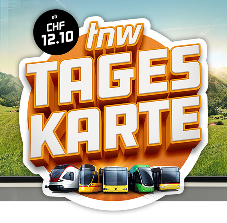 Die TNW-Tageskarte ist das ideale Ticket für erlebnisreiche Ausflüge im ganzen TNW-Gebiet. Entdecken Sie alle Vorteile der Tageskarte und gewinnen Sie einen von vier Tagesausflügen im Wert von CHF 500.–.